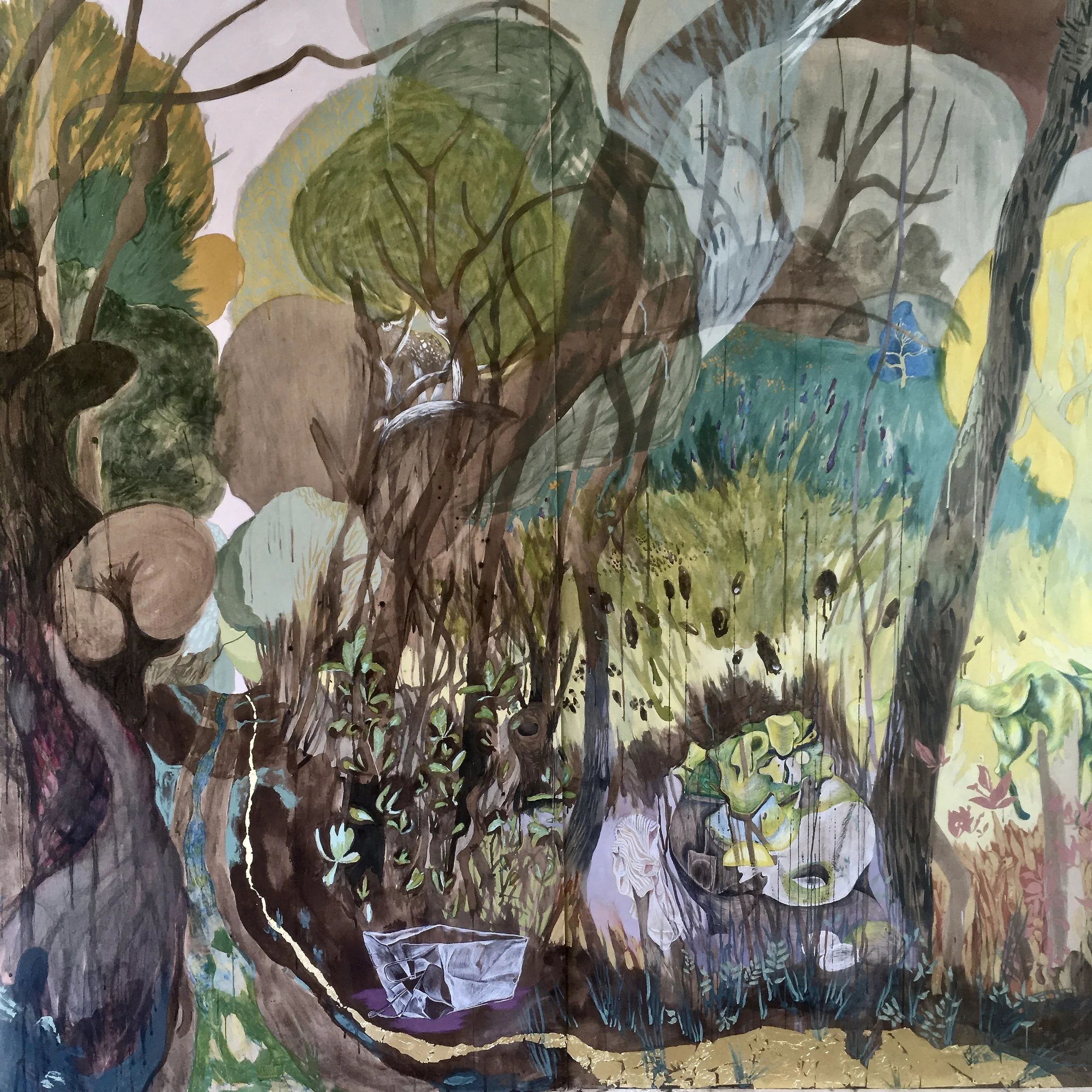 ANIMAL VILLAGE: B L INDS POT S (6’ x 8’), hand-gathered and ground pigments from oregon, nevada and utah, plus gold leaf, mined pigments (nicosia green, colorado pink pipe clay, and italian yellow earth) and petrochemical pigments (leaf green, rose pink, seafoam blue) on reclaimed plywood.