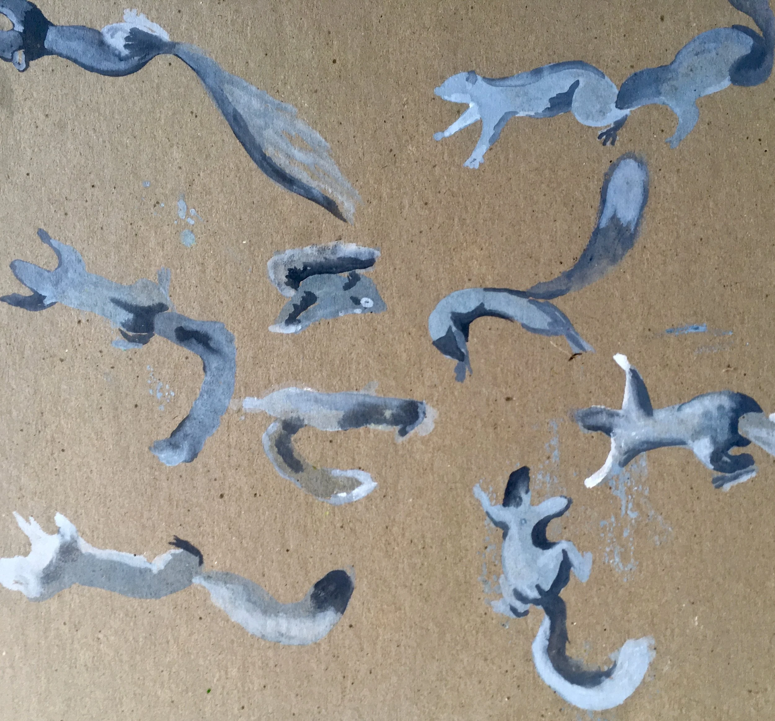 Squirrels; cardboard, riebeckite, titanium white; 8" x 7", March 2017.