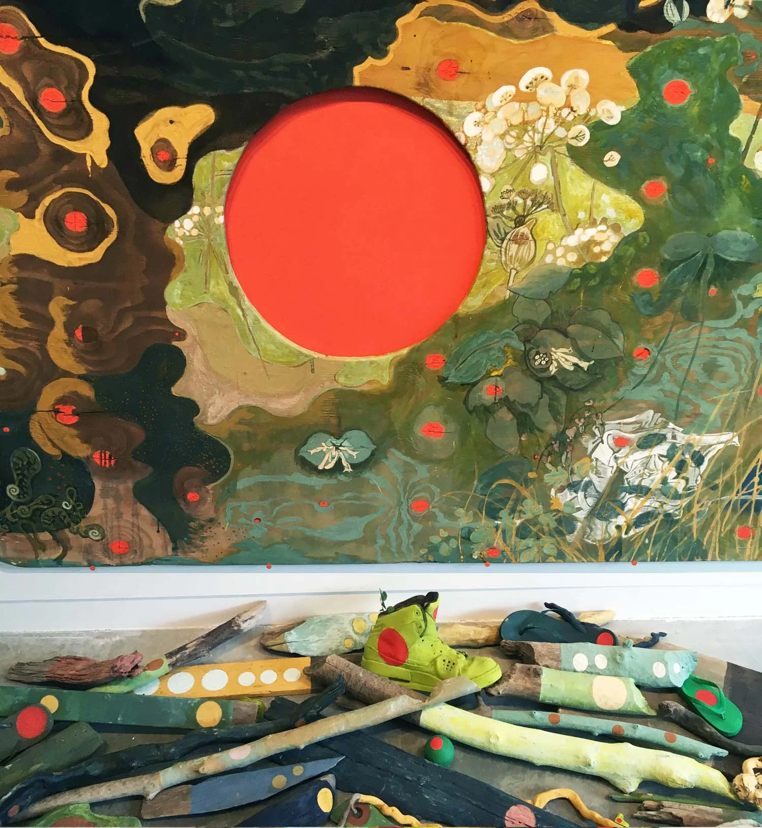 G R IE FUN T ANGLE M E N T (Grief Untanglement) 6ft x 3.5 ft plus objects; cadmium red gouache, plant and mineral pigments on reclaimed wooden object of indeterminate use. river driftwood and riverbank found objects. pigments include: walnut ink, indigo, gamboge, nicosia green, zinc white, azurite, dioptase, yellow ochre, blue ridge ochre, colorado pink pipe clay. Objects pictured returned to the site where they were found. July, 2018. Last photo by Kelly Moody.