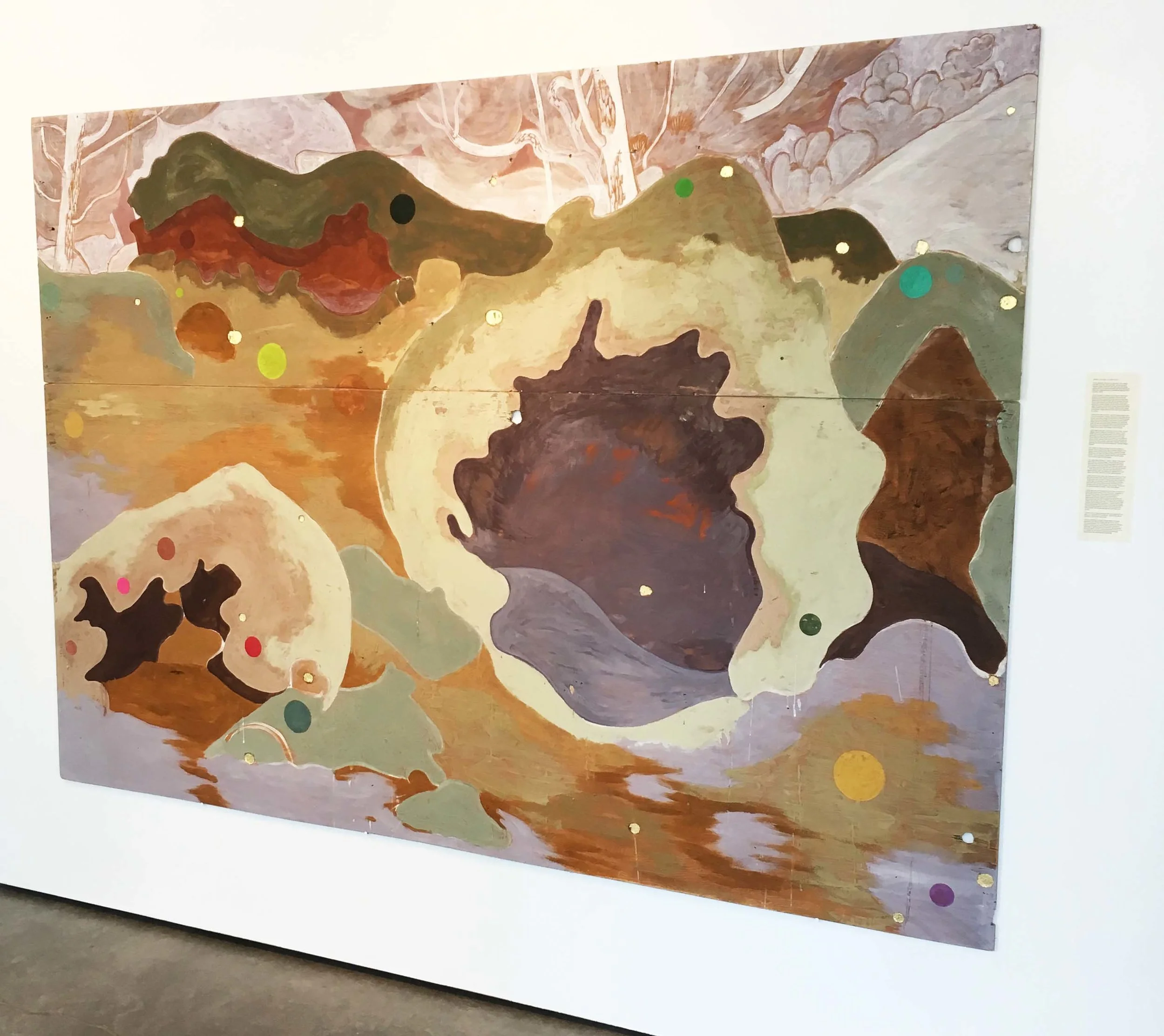 ANIMAL VILLAGE: B L INDS POT S (6’ x 8’), hand-gathered and ground pigments from oregon, nevada and utah, plus gold leaf, mined pigments (nicosia green, colorado pink pipe clay, and italian yellow earth) and petrochemical pigments (leaf green, rose pink, seafoam blue) on reclaimed plywood.